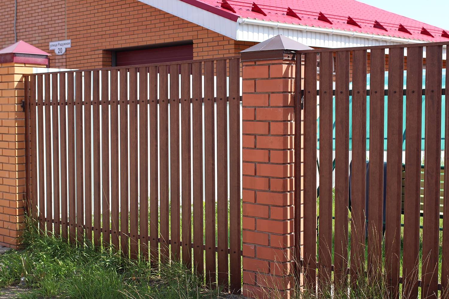 Заборы и ограждения из евроштакетника с кирпичными столбами 8 соток в Дмитрове