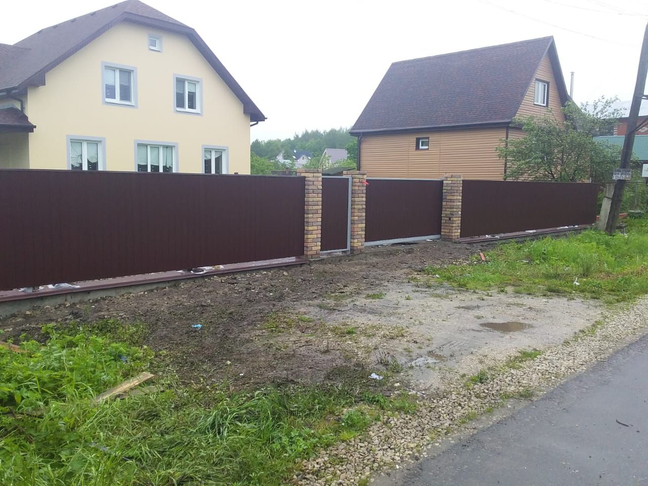 Заборы и ограждения из профнастила с кирпичными столбами 30 соток в Дмитрове